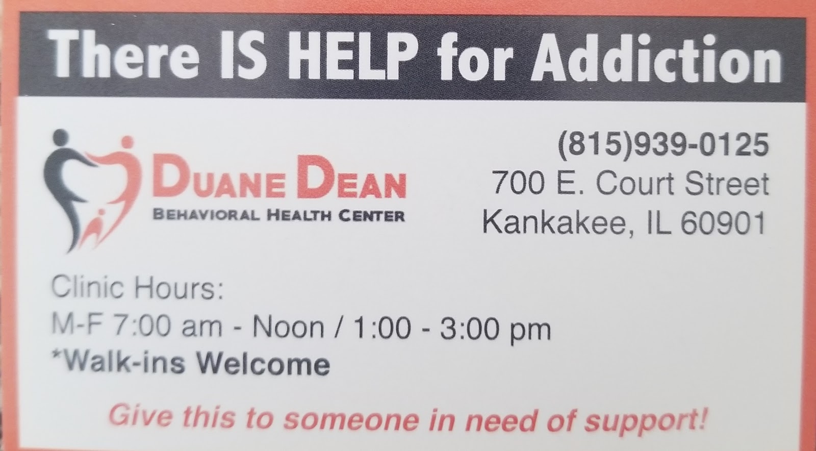 Duane Dean Behavioral Health Center is an accredited substance abuse treatment center that provides outpatient detoxification, for men and women between 18 and 65+ years of age. As part of their special programs, Duane Dean Behavioral Health Center treats criminal justice (other than dui/dwi)/forensic clients and clients who have experienced trauma. To help patients achieve sobriety, Duane Dean Behavioral Health Center provides treats opioids detoxification and medication routinely used during detoxification.. Afterward, patients receive cognitive behavioral therapy, telemedicine/telehealth therapy, and substance use disorder counseling during treatment. Duane Dean Behavioral Health Center is located in Kankakee, Illinois, providing treatment for people in Kankakee County, accepting cash or self-payment, medicaid, and medicare.